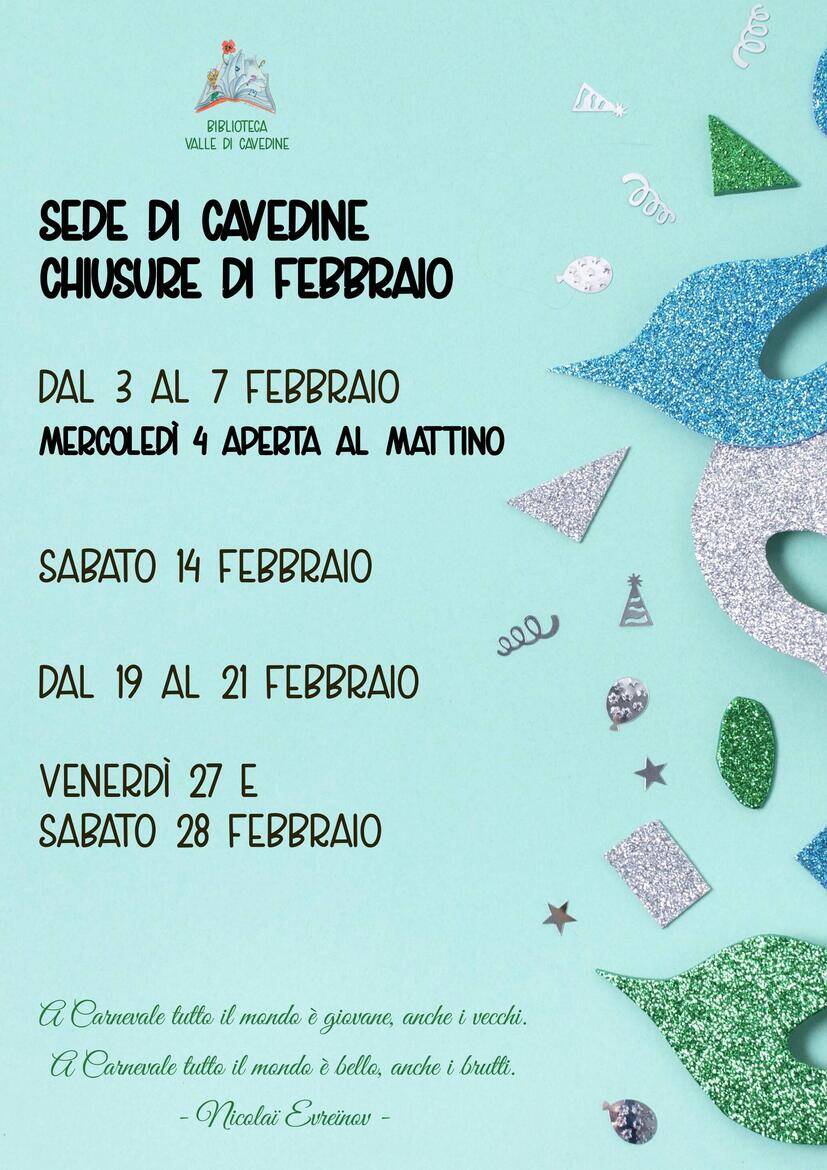 - dal 3 al 7 febbraio (mercoledì 4 febbraio aperta al mattino)