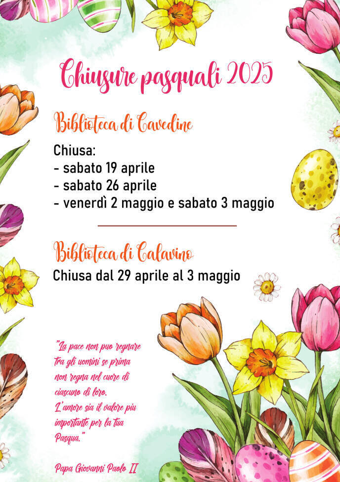 - Biblioteca di Cavedine: sabato 19 aprile - sabato 26 aprile - venerdì 2 e sabato 3 maggio