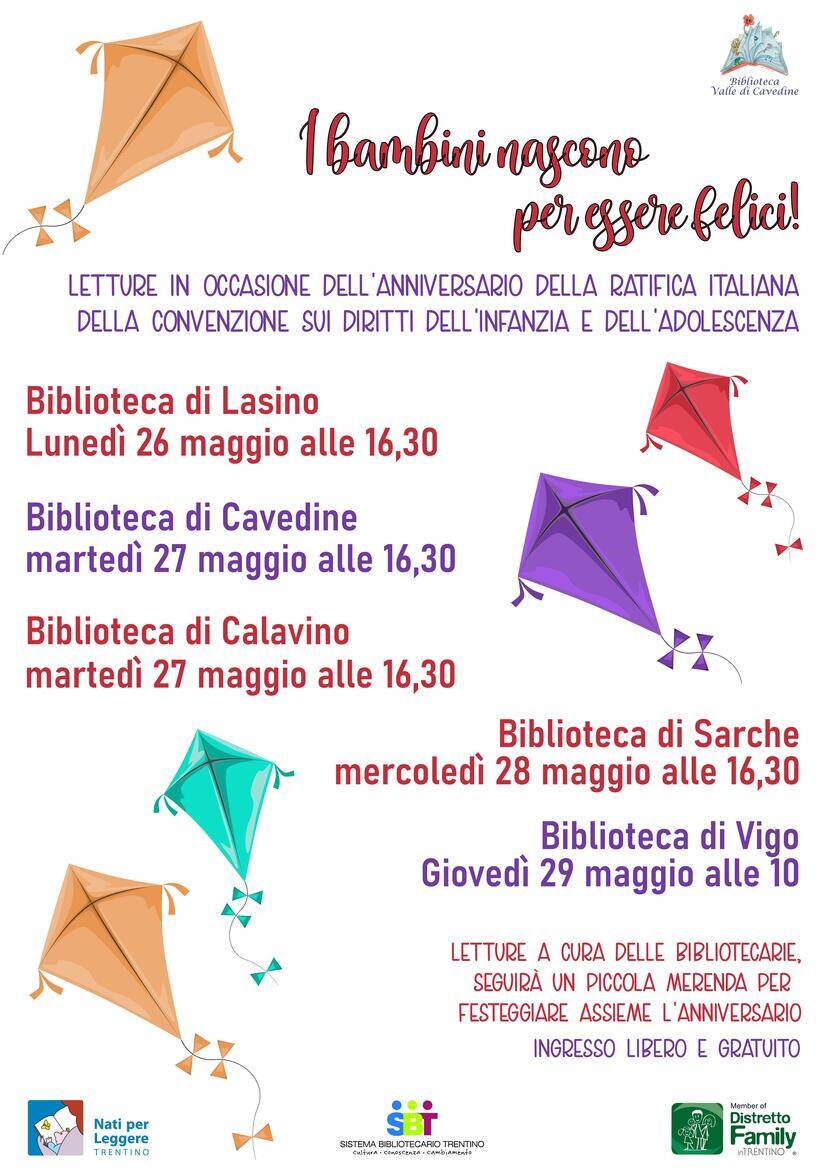 Cinque letture per bambine, bambini e famiglie a cura delle bibliotecarie e piccole merende per festeggiare assieme l'anniversario. Ad ogni famiglia presente sarà donata una stampa del poster con il racconto dei diritti delle bambine, dei bambini e degli adolescenti che compongono la Convenzione.