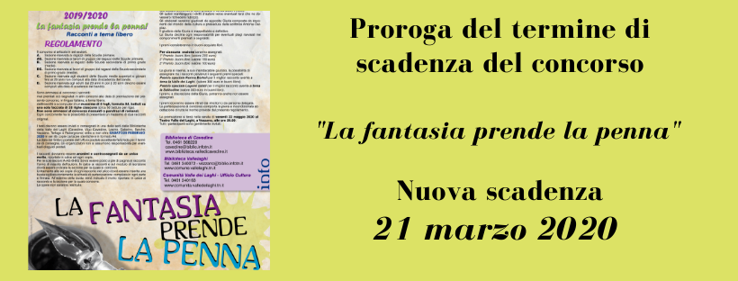 E' stato prorogato a SABATO 21 MARZO 2020 il termine di scadenza della 10° Edizione del concorso di scrittura creativa "La fantasia prende la penna".