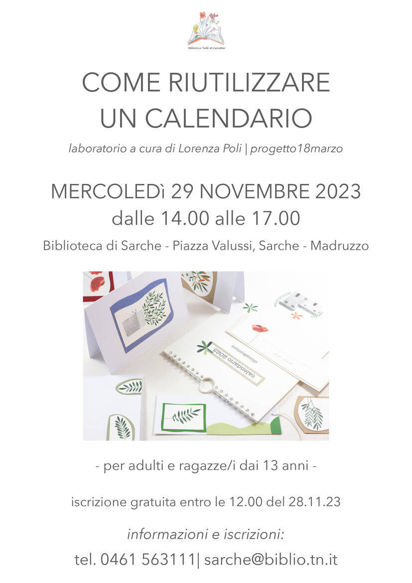 Mercoledì 29 novembre in biblioteca a Sarche proponiamo l'originale laboratorio "Come riutilizzare un calendario".Realizzeremo delicati biglietti, segnaposto e tanto altro...Tipologia: laboratorio gratuito con materiale di riusoDiretto a: adulti e ragazzi dai 13 anniA cura di: Lorenza Poli progetto18marzoLe iscrizioni sono aperte, posti limitati.