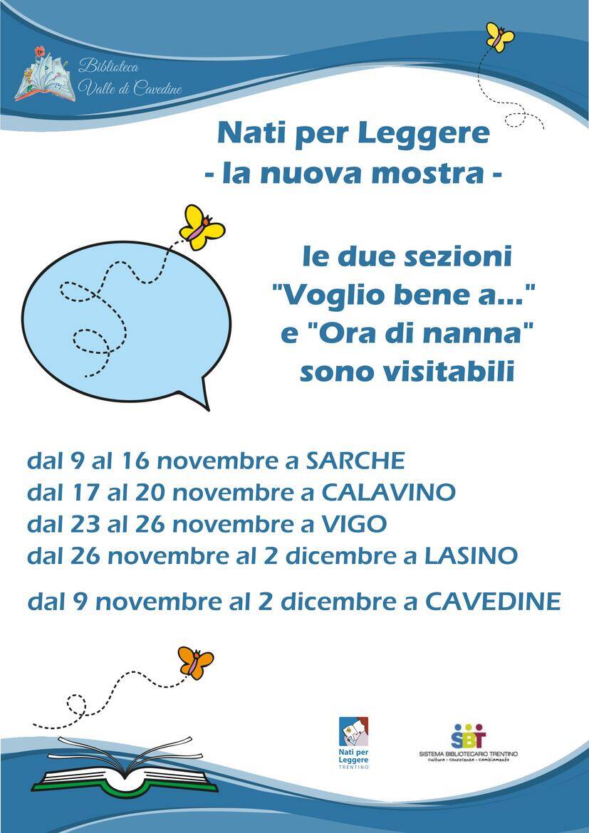 Arriva nelle nostre biblioteche l'attesa nuova mostra di Nati per leggere. Due le sezioni che potrete visitare "Voglio bene a..." e "Ora di nanna". Queste le date: dal 9 al 16 novembre a Sarche; dal 17 al 20 novembre a Calavino; dal 23 al 26 novembre a Vigo Cavedine; dal 26 novembre al 2 dicembre a Lasino; dal 9 novembre al 2 dicembre a Cavedine.